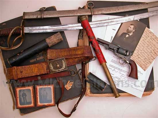 Found in an old chest in St. Paul, Minnesota years ago, these items were originally the property of Lt. Clinton McChord of Co. B, 3rd Iowa Cavalry. McChord enlisted on 8/30/61 and served until muster-out in August of 1865. The set includes a good condition Colt Pocket Revolver, Roby Cavalry Sabre, Cavalry Sword belt & hangers, a piece of his sabre knot, Telescope w/original case, 2 original tintypes of McChord in uniform, a CDV of our hero taken post-war with cardstock describing his service, some transcribed excerpts from original letters that were so tattered they went south long ago(unsalvageable), and Volumes I & II of Harper's Lithographs of the Great Rebellion saved by our trooper. All items are in very good to fine condition with the exception of the two volumes which I rate as fair. You don't see many groupings coming out these days, and I was very happy to aquire this one. I can't keep everything, but I was tempted on this one. The 3rd Iowa saw some violent action at Pea Ridge, LaGrange as well as many smaller skirmishes throughout the war. They had more losses than most Cavalry units in the West, losing 5 officers and 79 enlisted men killed or mortally wounded in action. For those of you that like ID'd material and would like a little of everything that a Cavalry officer may have attached himself to, this is one-stop shopping. A small collection in itself, and ID'd Iowa items are not easy to come by.