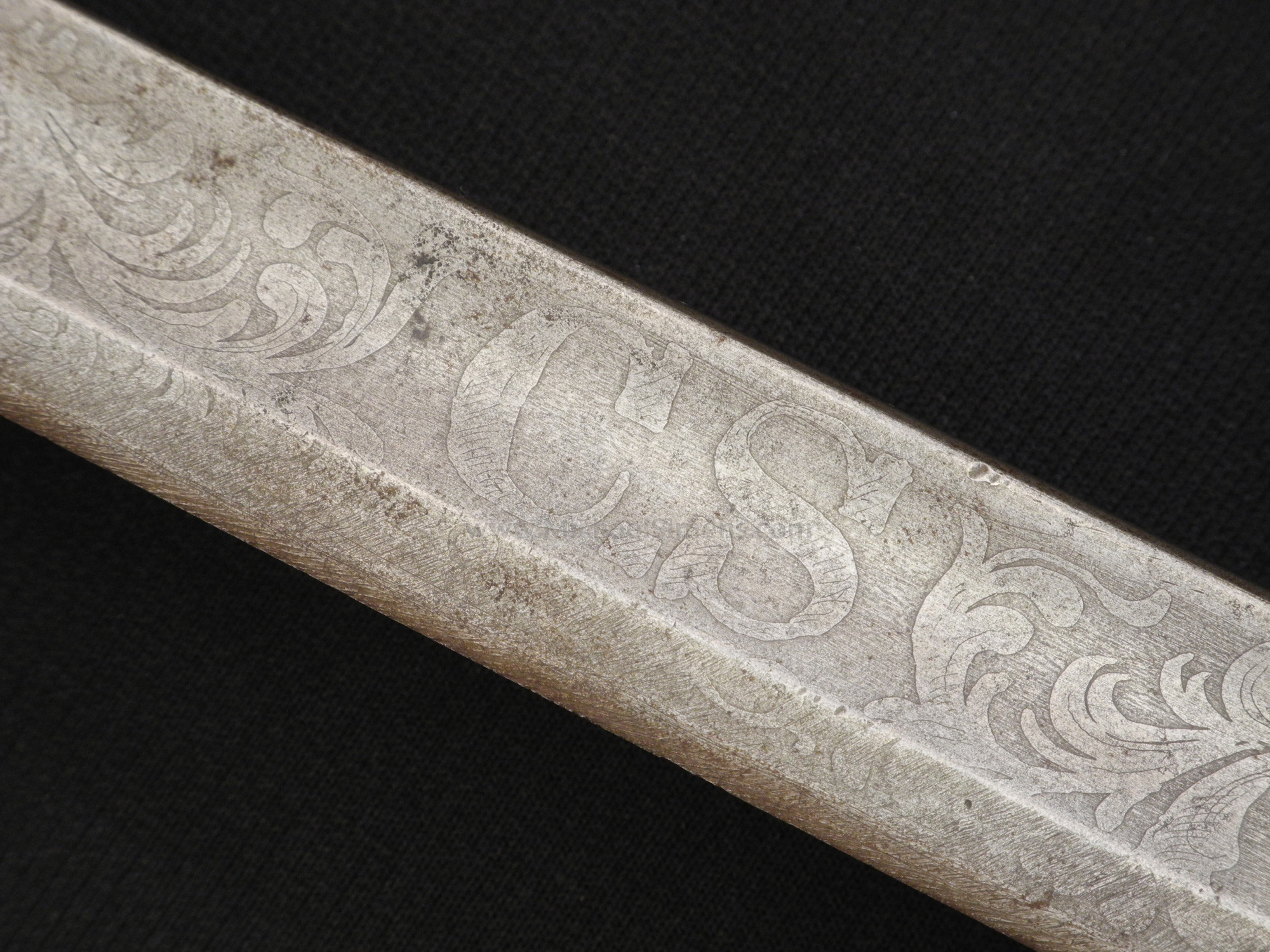 This is a very strong condition Confederate Foot Officers Sword by E. J. Johnson of Macon, Georgia. It has no scabbard but the sword itself is in very fine condition. It retains its near perfect and original polished wood grip with wire wrap, shows part of the original felt washer and a full length blade that shows 100% original etch with bold "CS" and patriotic motifs and a perfect "E. J. Johnson" makers etch. A great example of one of the best made Confederate Officers swords and one of the most popular due to their strong construction, attractive grips and deep etching.