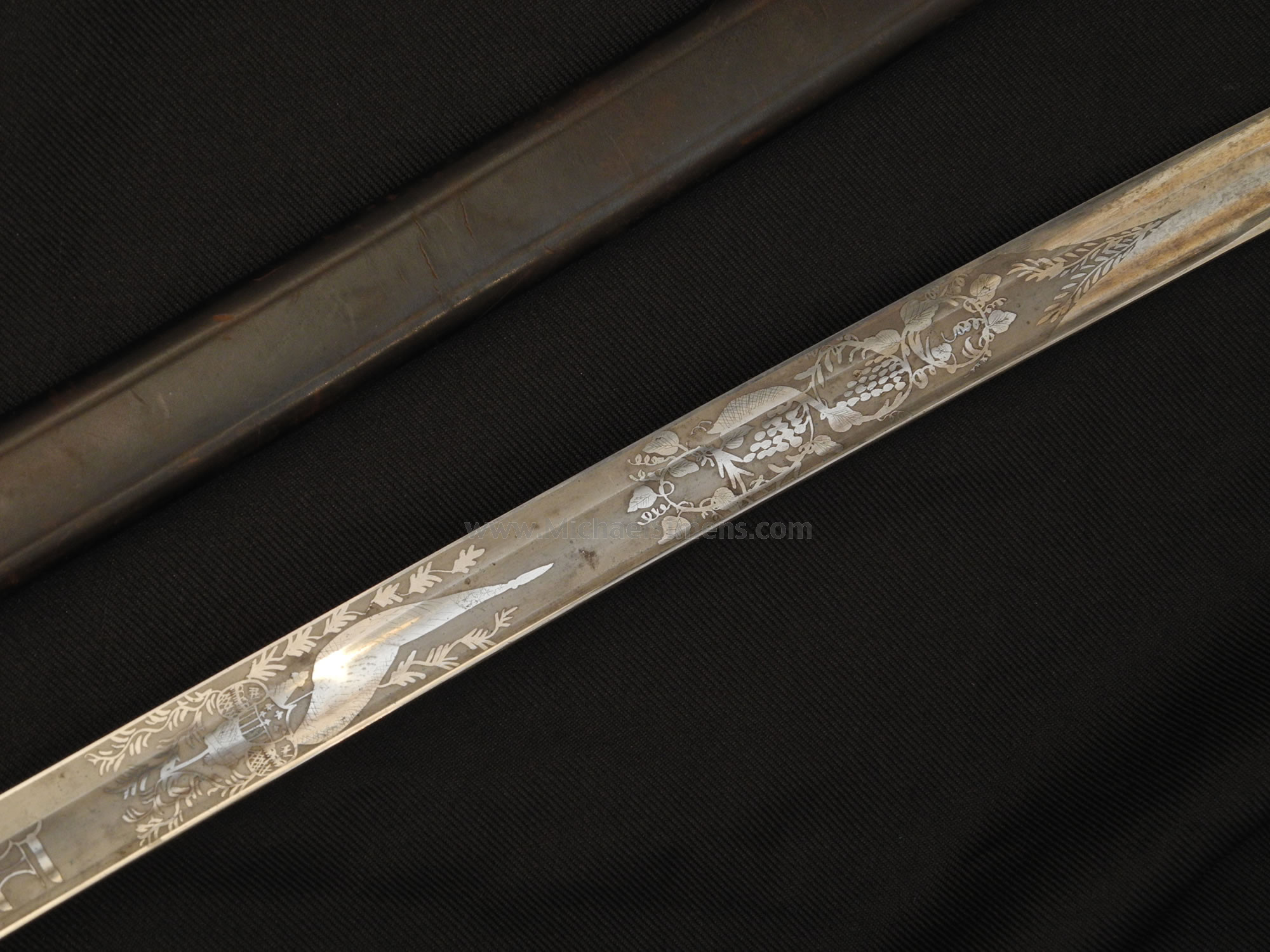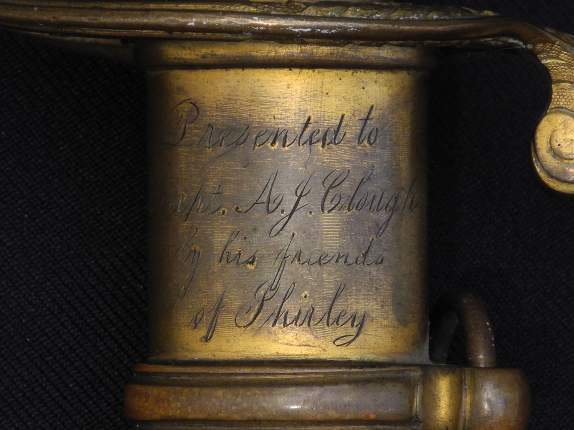 Christopher Roby Manufacturing Company of West Chelmsford, Massachusetts produced high-grade edged weapons for private purchase as well as swords purchased under contract by the U. S. Government for issue to US and State Volunteer Troops. This is a really fine and untouched Roby Foot Officers sword inscribed on the throat, "Presented to Capt. A. J. Clough by his friends of Shirley". Clough was commissioned into Company D. of the 53rd Massachusetts Infantry. He was only in for a few months, being discharged for disability and probably saw no action. However what we have here is a sword that was presented and seldom used. Clough took care of the sword and the same was done through the ages until this day and the care with which it was kept leaves us with an almost mint blade and excellent condition scabbard. The mounts and hilt show 50 - 70% original gold gilt. A nice cleaning and oiling will provide a collector with a really excellent condition Roby to add to his collection. Roby is one of the most popular of Union made Officers Swords and they are seldom found in this exceptional condition.