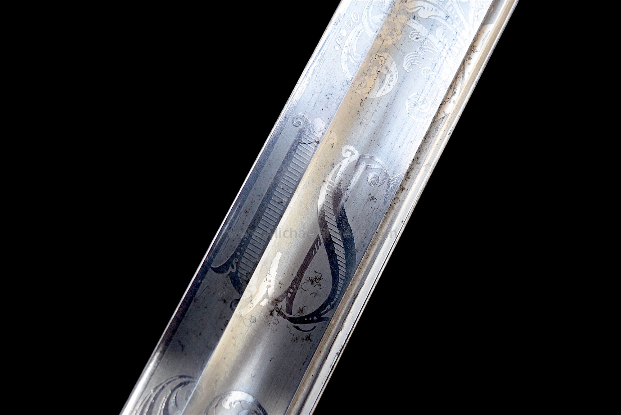 This is a wonderful, Civil War era, presentation grade Staff & Field Officers Sword in excellent condition. It shows a cast decorative German Silver grip in virtually mint condition. The hilt and mounts (to include the drag) retain 90%+ gold gilt and the beautifully engraved scabbard is of German Silver with silver or nickel plating. The guard terminates at its top with a fierce, patriotic eagle. The blade is also near mint, showing 100% frosty etching. Now this sword does not have a presentation on it, but it was either purchased for presentation purposes or purchased by an officer who wanted a highly decorated sword. This is a great sword at a great price for a collector that wants a high condition, high grade sword but who doesn't want to pay the $2,000+ premium to find one in similar condition with a name on it.