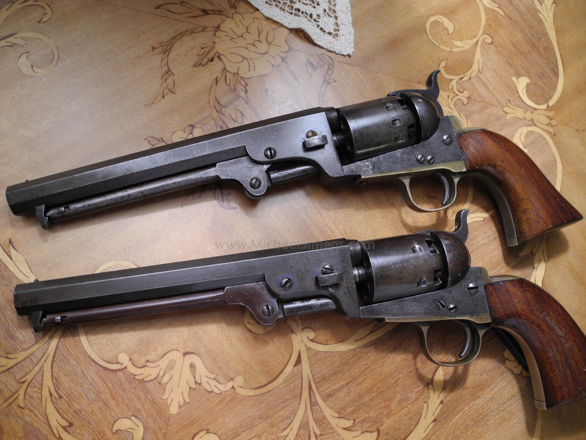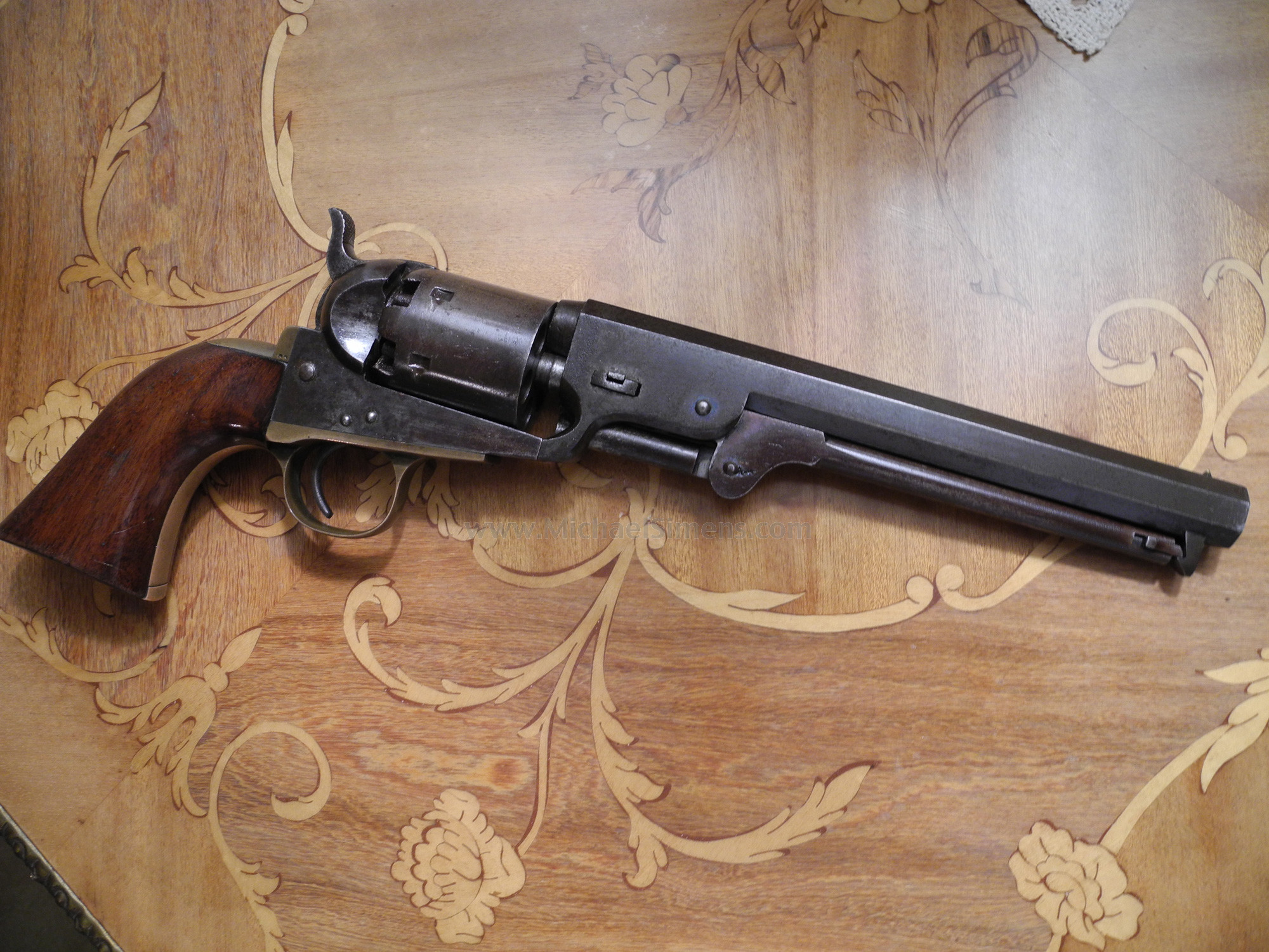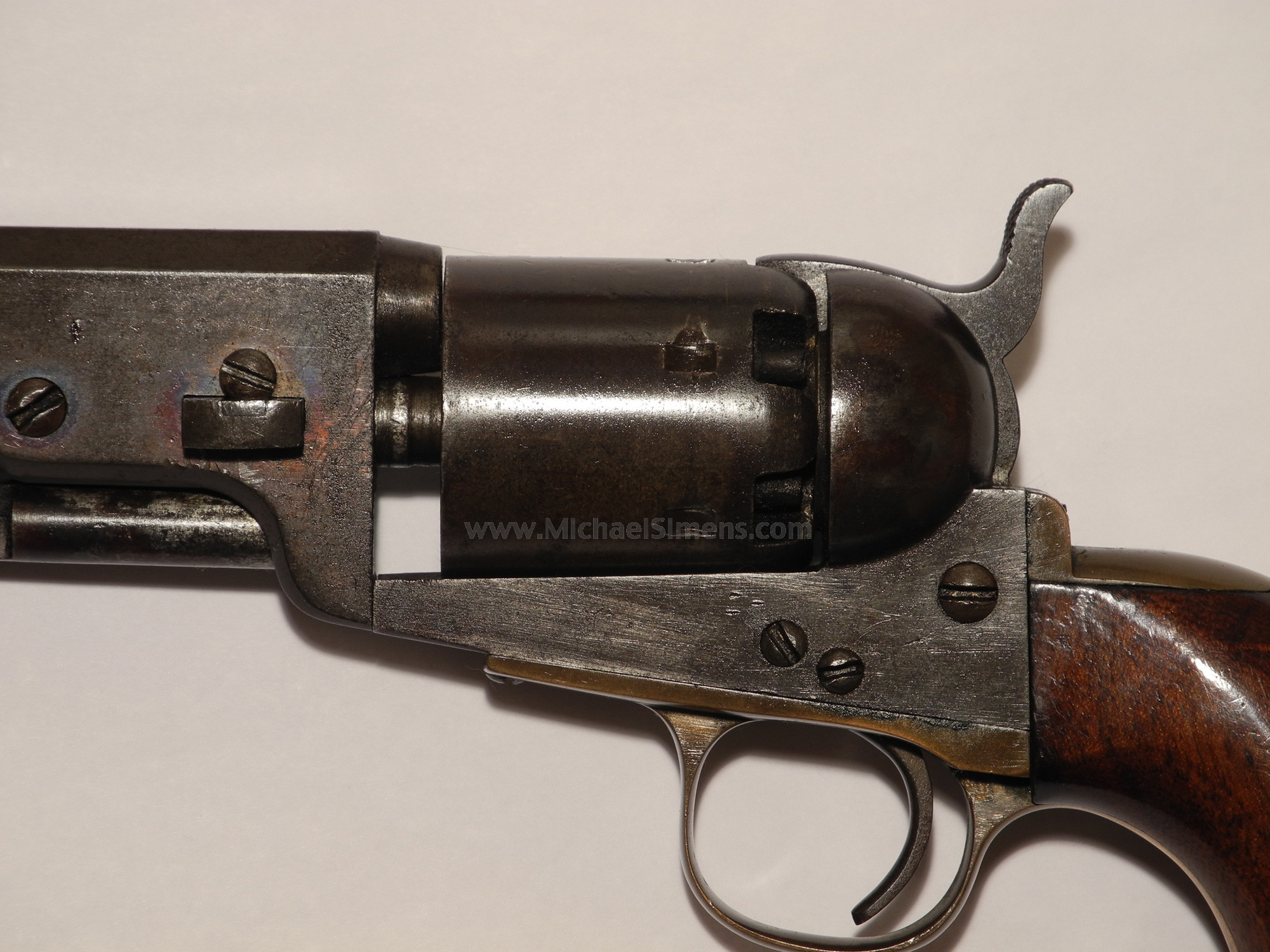 This is an extremely fine condition Augusta Machine Works Revolver that is so nice it gives chills. It actually has about 15 % original fire blue on the barrel, mostly in protected areas and so thin a strong wind could blow it off. That's original blue, not some faked garbage that you see on many Confederate guns that the so-called Guru's claim is original. This gun shows almost no use and its original finish is blending with an absolutely untouched brown patina that is gorgeous. The grips, action, edges and markings are near perfect. You can find its brother in one of the included photos, a 12-stop that is rare as all get-out and also has a trace of color. You can find that one elsewhere on this website. I will consider trades on either of these guns. I'm looking for a few high condition Colt Percussions, cased and/or engraved.