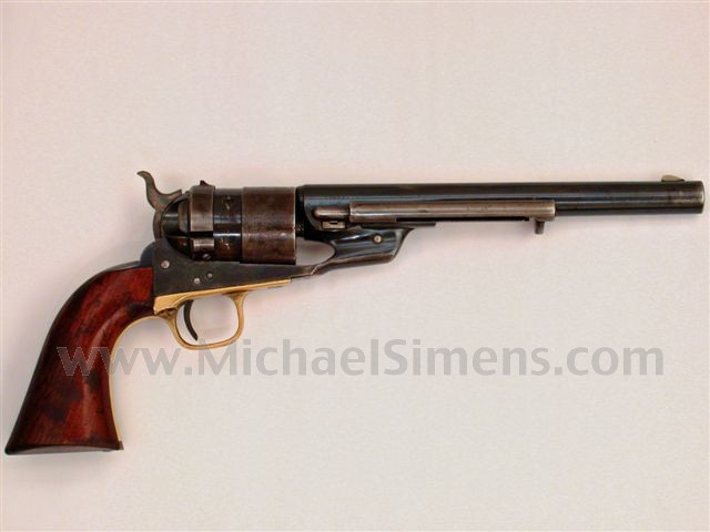 This is a strong condition Conversion of the classic big framed Army. It retains about 70% blue on the barrel and most on the rebate. The scene is clear and its finish a deep, plum-brown patina. The frame shows muted case-colors with flashes of vividness. Grips are fine and full with most of their varnish and a crack on the left panel where it meets the frame. The holster is excellent and was found with an old Richards/Mason in it. It's definitely of the period and was made for a conversion. It's lined and it's nice. Priced seperately