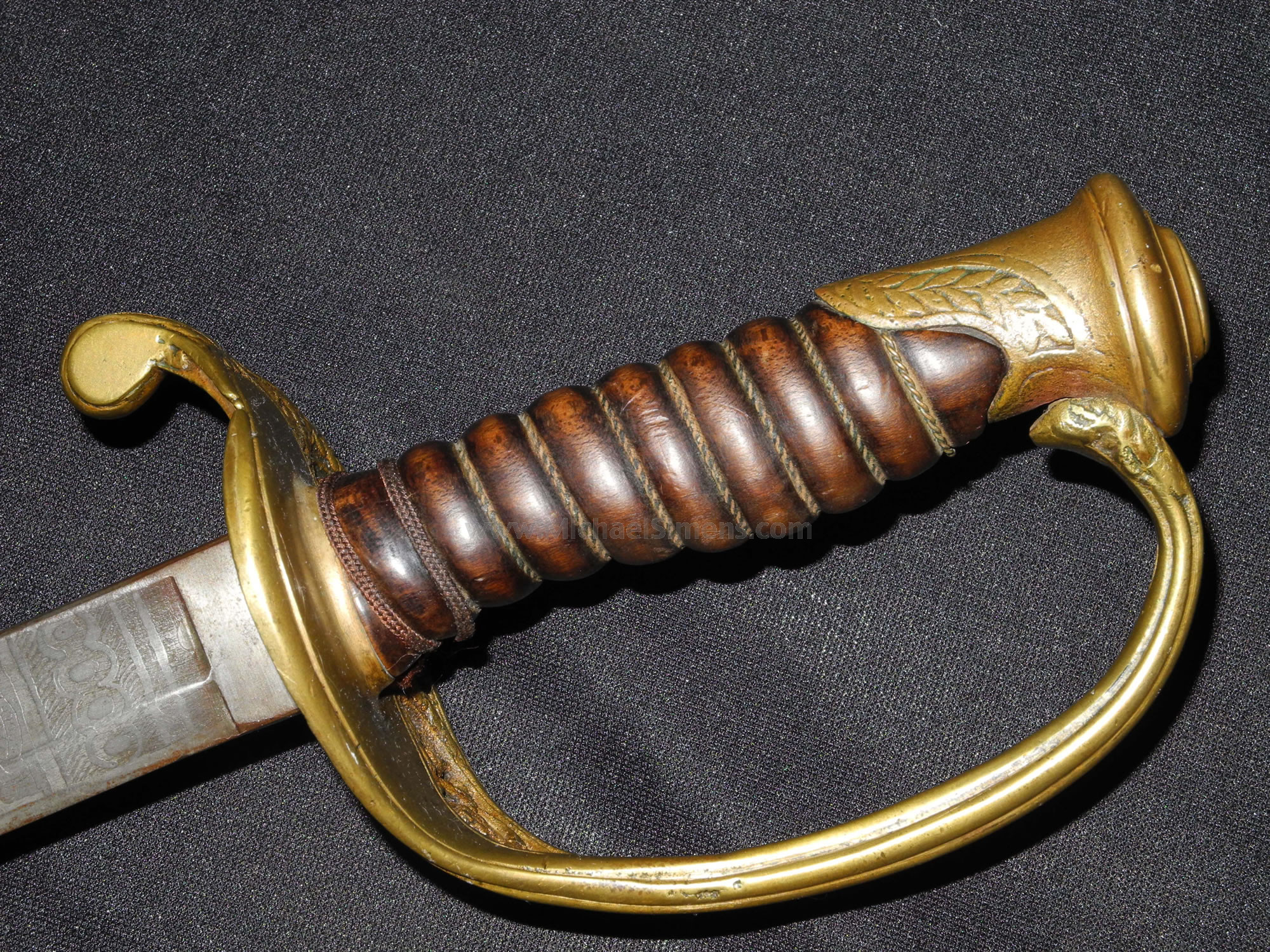 This is a very strong condition Confederate Foot Officers Sword by E. J. Johnson of Macon, Georgia. It has no scabbard but the sword itself is in very fine condition. It retains its near perfect and original polished wood grip with wire wrap, shows part of the original felt washer and a full length blade that shows 100% original etch with bold "CS" and patriotic motifs and a perfect "E. J. Johnson" makers etch. A great example of one of the best made Confederate Officers swords and one of the most popular due to their strong construction, attractive grips and deep etching.