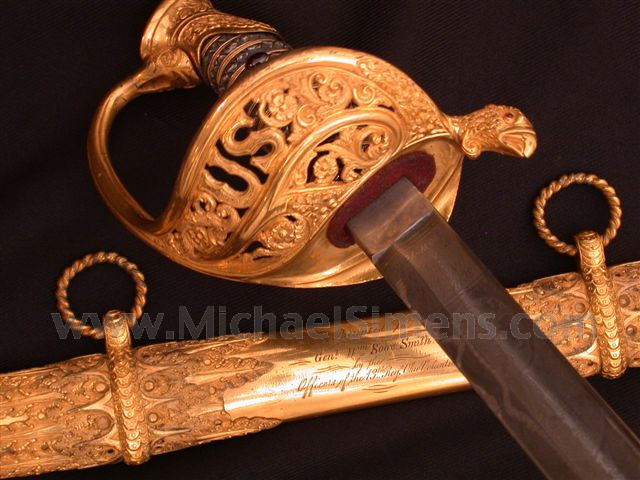 General Sooy Smith was a favorite of both General U.S. Grant and General W.T. Sherman serving as Commanding Officer of the 1st Division 16th Army Corps during the Vicksburg Campaign, Chief of Cavalry - Department of the Tennessee July to October of 1863 and as Chief of Cavalry Military Division of the Mississippi - October to July of 1864. This sword is a spectacular example of the high grade staff and field swords that were made-up from imported Clauberg parts. Please refer to pages 499 & 500 of Civil War Army Swords for additional images and details of this sword. It was presented to General Sooy Smith by the Officers of the 13th Regt of Ohio Volunteers, his first regiment and with whom he fought until his elevation to General Officer. The hilt and scabbard have a heavily applied gilt finish with a cast silver grip and applied semi precious jewels on both the grip and in the eyes of the Eagle head quillon. The scabbard mounts are wide cast and chased to resemble long tendrils of foliate but from a distance resemble golden icicles with an extremely rich overall appearance. The hilt and scabbard are likely made from Clauberg parts imported by Bailey & Company who were retailers of fine military goods. The cast silver grip (possibly German Silver) appears to be American made and the stones indicate the likely assembly by Bailey, who was known for this specific embellishment. The sword was definitely assembled and finished in the US. The blade is wonderfully etched with martial themes. This is a rarely seen and very richly appointed presentation sword to a President Lincoln appointed and congressionally approved General Officer with great Civil War history. For the very finest institutional, museum or personal collection.