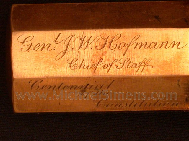 In the world of Civil War Artifacts Collecting, this might be one of the most Iconic artifacts ever offered for sale in terms of its association with the greatest battle of that struggle, GETTYSBURG. The westernmost ridge temporarily separated the opposing forces. As Hoffman reached the crest of the middle ridge, he saw a line of battle approaching far to his right and 'just rising to the crest of the swell west of the one we were on.' Brigadier General Cutler, in a letter to Pennsylvania's Governor Curtain, later described the moment. "The atmosphere being a little thick [smoke form the cavalry skirmish]. I took out my glasses to examine the enemy. Being a few paces in the rear of Colonel Hoffman, he turned to me an inquired 'Is that the enemy?' My reply was 'Yes". Turning to his men he commanded 'Ready, right oblique, aim, fire!', and the Battle of Gettysburg was opened.". His military history is as follows; With the outbreak of civil war in April 1861, Hofmann was quick to offer his services to his country. Less than a week after the capitulation of Fort Sumter, Hofmann was mustered into service as a captain in the three-month 23rd Pennsylvania Volunteer Infantry. The 23rd spent most of its time in service in the Shenandoah Valley, serving under General Robert Patterson, but seeing no substantial action. In the summer of 1861, after having been mustered out of the 23rd Pennsylvania, Hofmann helped raise and organize the 56th Pennsylvania, a three-year unit, and in October he reentered service as the regiment’s lieutenant-colonel. Remaining at Camp Curtin in Harrisburg for the next six months, the 56th then traveled south to Virginia but did not see any major combat until the Second Battle of Bull Run, fought during the final days of August 1862. Here, in their baptism by fire, the men of the 56th sustained heavy losses, including its colonel, Sullivan Meredith, who fell gravely wounded on the first day’s battle. After Meredith’s wounding, command of the regiment devolved upon Hofmann. With George McClellan’s reorganization of the Army of the Potomac in early September 1862, the 56th Pennsylvania formed part of General Abner Doubleday’s brigade, in John Hatch’s First Corps division. Hofmann continued at the helm of his regiment until the September 14, 1862, battle at South Mountain. As the 56th entered the battle late in the day, Hofmann saw division commander John Hatch being carried to rear, seriously wounded. Command of the division then fell upon Doubleday, who, in turn, handed command of his brigade over to its senior colonel, William Wainwright of the 76th New York. After Wainwright fell wounded just a short time later, Hofmann assumed command of the brigade, which he commanded three days later at Antietam. Crossing the Antietam Creek on the afternoon of September 16, Hofmann’s brigade took up position on the extreme right of the First Corps line. Early the following morning, as Doubleday’s division advanced south along the Hagerstown Turnpike and engaged Stonewall Jackson’s men in the West Woods and the Cornfield, Hofmann’s men were held in reserve, with orders to support the First Corps artillery. They remained in this position for most of the day, and as a result, suffered little loss. Indeed, total casualties in Hofmann’s brigade at the battle of Antietam numbered just ten men wounded. Two months following the battle of Antietam, on November 11, 1862, Hofmann reassumed command of the 56th Pennsylvania upon the return of Colonel Wainwright, who had recovered from his South Mountain wound. At the battle of Fredericksburg, Hofmann’s regiment was only lightly engaged, suffering few casualties. In January 1863 Hofmann was at last promoted to the rank of colonel, after having led a regiment and even a brigade at the rank of lieutenant-colonel since August 1862. Again held in reserve at Chancellorsville in May 1863, Hofmann’s shining moment of the war came two months later at Gettysburg. Leading the advance of the First Corps on July 1, Hofmann’s men were the first Union infantry on the field and the first to open fire on the advancing legions of Confederate troops under Generals Heth and Pender. In the desperate fighting near the Railroad Cut, Hofmann’s regiment lost 130 men killed, wounded, and missing, 52% of its total number. On July 25, 1863, Colonel Hofmann was ordered to his hometown of Philadelphia with orders to help oversee the implementation of the draft in the city, but was back with his regiment in time to participate in the Mine Run Campaign that fall. During the Overland Campaign in the spring of 1864, Hofmann saw action at the battle of the Wilderness, where his regiment again sustained severe loss, and at Spotsylvania. Following the latter battle, Hofmann was again elevated brigade command. Throughout the summer and fall of 1864, Hofmann led his brigade during the North Anna Campaign, and on the initial assaults at Petersburg. At the battle of Weldon Railroad on August 18, Hofmann’s brigade turned in a distinguished performance and by the end of the day had captured three Confederate battle flags. Although brevetted brigadier general of volunteers on August 1, 1864, for “brave, constant, and efficient services in the battles and marches of the campaign,” Hofmann still held the rank of colonel. After seeing further action at Hatcher’s Run and at Pegram’s Fall in the late summer of 1864, Hofmann tendered his resignation from the army on March 7, 1865, and returned to his home in Philadelphia. Little is known of Hofmann’s post-war career. It is assumed that he returned to his business, which, during his time in the army, was managed by his wife, Margaretta. He did remain active in military affairs, serving for four years as a brigadier general in the Pennsylvania National Guard. Colonel Hofmann died in his seventy-eighth year, on March 5, 1902. He was buried in Philadelphia’s Laurel Hill Cemetery. This magnificent sword is in