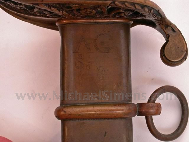 This is a wonderfull, rare and historic Confederate sword. Adam Given enlisted as a Lieutenant in Captain George Hammonds Company of the 59th Infantry of Wise's Legion June 26, 1861. He was 23 years old and stood 6'4" tall with dark eyes. After being merged with the 60th, Given was made Captain and served throughout the war. His unit saw action at Sewell Mountain, Seven Days, Mechanicsville, Gaines Mills, Cloyd's Mountain, Piedmont, Winchester, Cedar Creek, and Waynesboro among others. He was cited for gallantry at Seven Days by Brigadier General Charles Field, was wounded in action at Belle Grove Cloyd's Mountain and captured late in the war at Waynesboro with a good portion with his regiment. He was imprisoned at Fort Delaware in March and released in June, 1865. The sword is beautiful and untouched. As is usual with Johnson Foots, the grip is polished wood with wire wrap and never had leather. The blade is excellent with no corossion or pitting and is a smooth patina. The guard and mounts are a wonderfull, deep rich patina and the hand-applied inscription is readable and original to the period. This sword comes with a notarized letter from the direct decendant of Given, his great-great-great grandson. It is wonderfull and undamaged. This is a premium sword and is priced very reasonably.