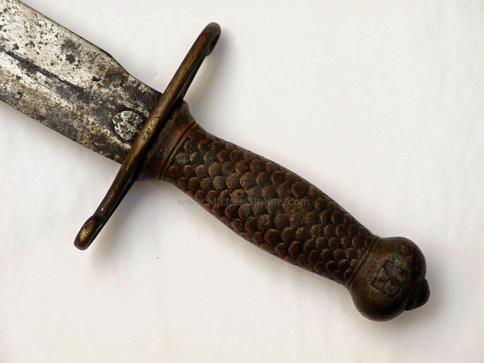 This is an extremely rare Confederate made Artillery Short Sword (sometimes called a Confederate Foot Artillery Sword). What makes this one unique is the original casting of the initials "JDA" onto one side of the pommel. Historians believe that this stands for "Jeff Davis Artillery", and that is why these are often referred to (but seldom seen) "Jeff Davis Artillery Swords". It is not known for certain where they were made nor what unit(s) may have used them, but they scream "Johnny Reb" from one end to the other. These are usually found in very poor condition and this example is probably better than average. It shows some pitting and a multitude of casting flaws on each side of the blade. The flaws are definitely Confederate earmarks as is the beautifully patinaed hilt, which shows an extremely high copper alloy content. I have had a couple inquiries about these over the years, so if you were one of the calls, come and get your sword. If you have one of these you wish to part with, let me know as we are always buying good Confederate Swords.