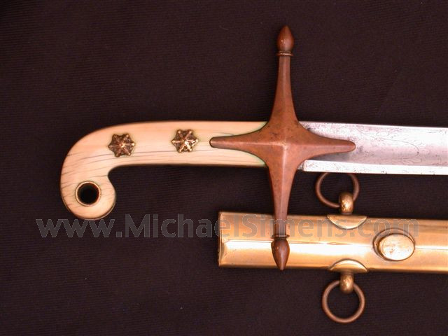 “To the Shores of Tripoli” goes the Marine Corps hymn. That part of the North African military history played by a small USMC detachment seeking to free the American shipping trade of the annual tribute and bribes to the Barbary Pirates is what inspired the USMC to adopt the Mameluke style of short saber for officers. This wonderful example was made by F.W. Widmann and is identified to Issac T. Doughty, inscribed “I.T. Doughty, / Marine Corps”. Early 19th Century identified USMC Mameluke swords are at the top of the heap of historic Naval weapons for rarity, desirability and being irreplaceable on today’s or in any previous antiques market. From its ivory hilt, brass scabbard and to the fine blade, this sword is in exceptional condition exhibiting all of the features of such a wonderful historically rare antique. F.W. Widmann swords are fairly scarce and they are also early being most often found in the 1830’s and 1840’s. This USMC officer’s sword a highly desirable example of a very rarely encountered type. It should occupy a treasured place in one of the finer American arms collections.